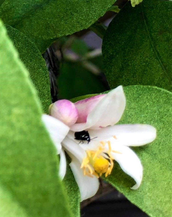 「 レモンの花」 登校途中に見つけた レモンの花 レモンの花つて初めて見ました^^ 薄ピンク色の可愛い花 蜜が甘いのか?! たくさんの虫が集まってきてました。 よくよく見ると 花びらに奥にこっそり テントウムシが・・・。 -iPhone8plus-